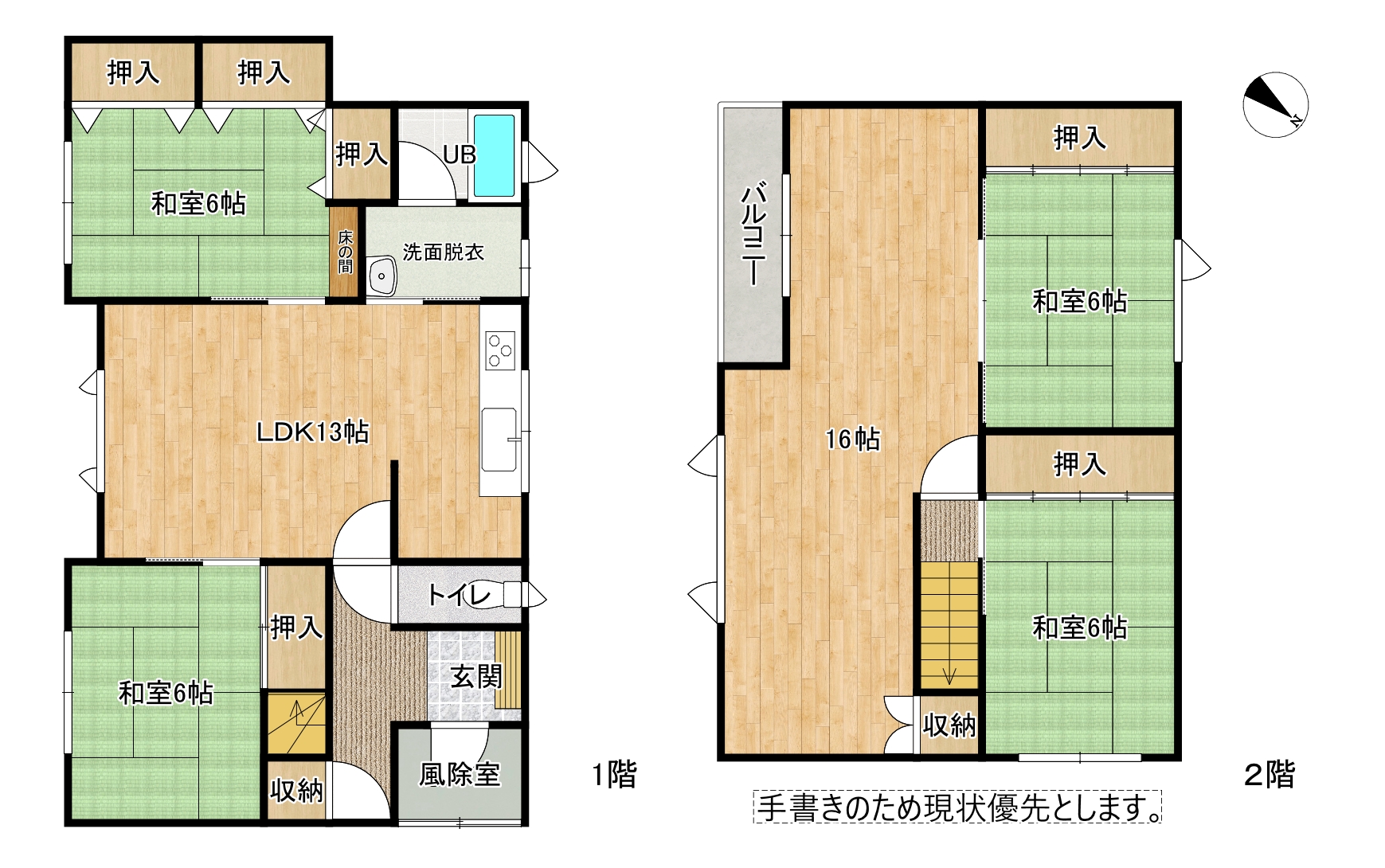 1階に2部屋あるので、1階和室を寝室・お子様の遊ぶ部屋などライフスタイルに合わせ様々な用途で利用できます★全部屋収納スペースがあり、2階には16帖の広々した洋室!南向きバルコニー🎶灯油ボイラー🎶灯油暖房🎶浴室窓🎶※敷地境界について、境界未確定又は既存のブロック塀や庭木等の越境がある場合はその越境を解消出来ない可能性があり、その場合は現況は現況でのお引渡しとなります。