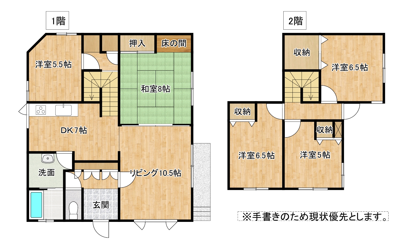 | 間取り詳細 | 1階:L10.5帖 DK7帖 和室8帖 洋室5.5帖 / 2階:洋室6.5帖 洋室6.5帖 洋室5帖 |